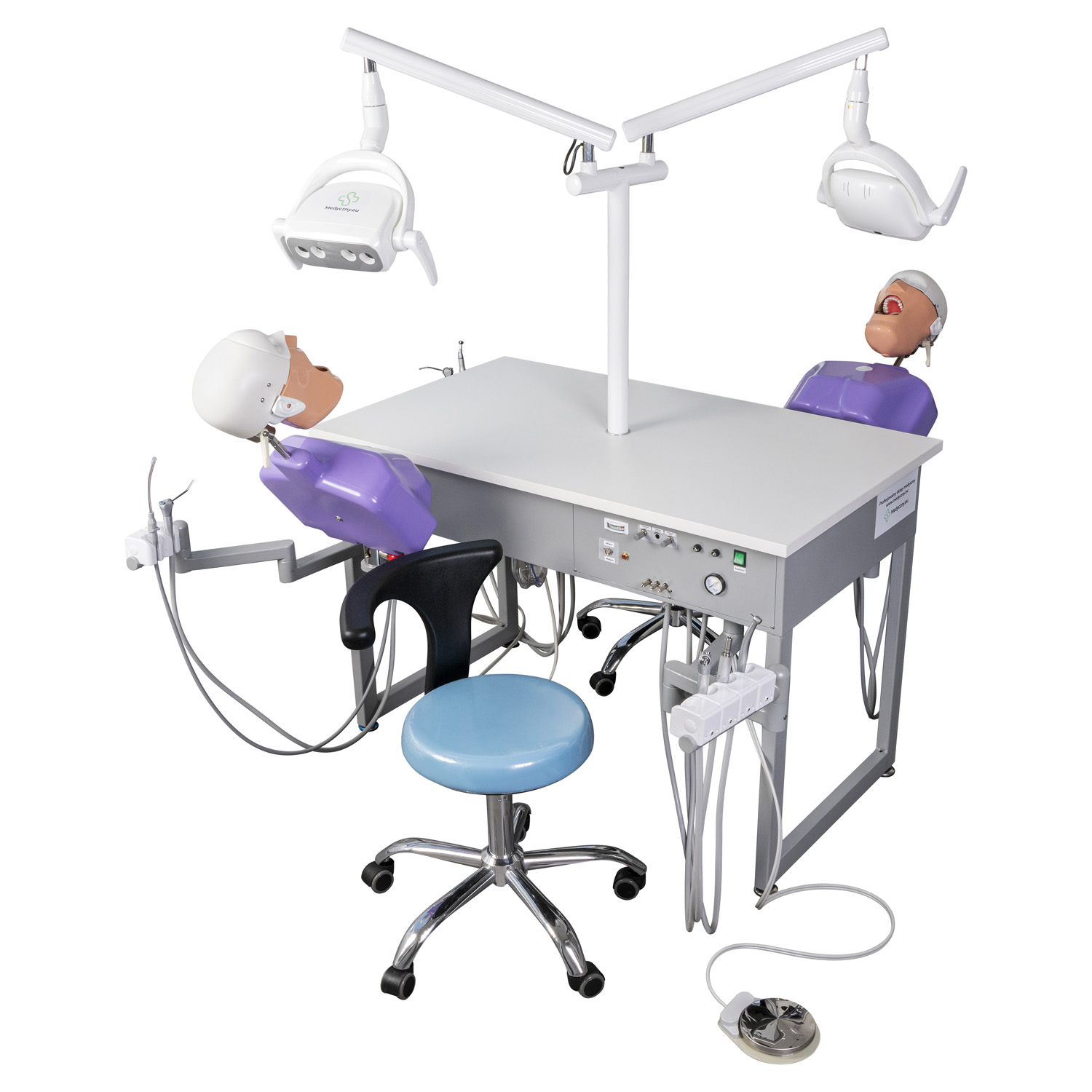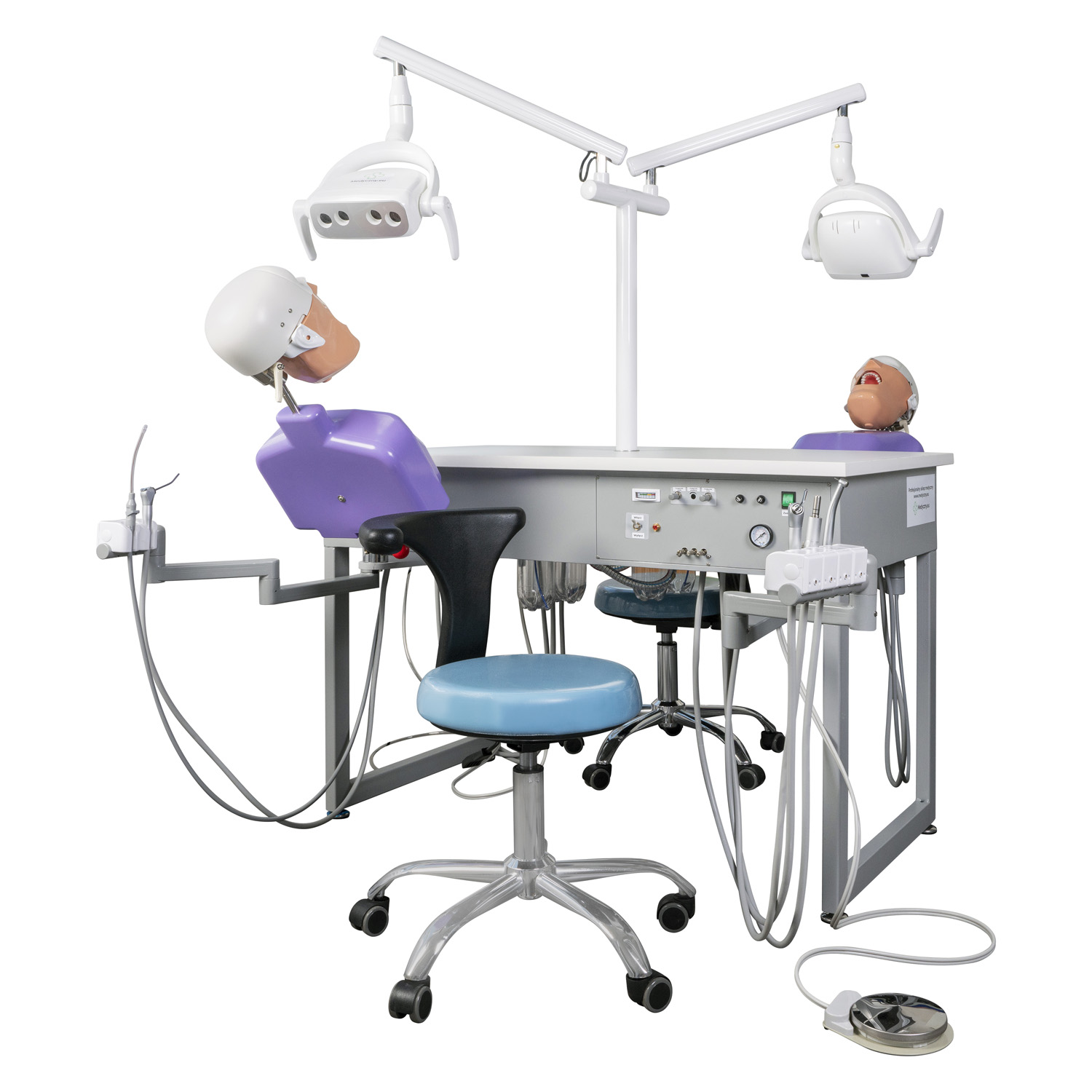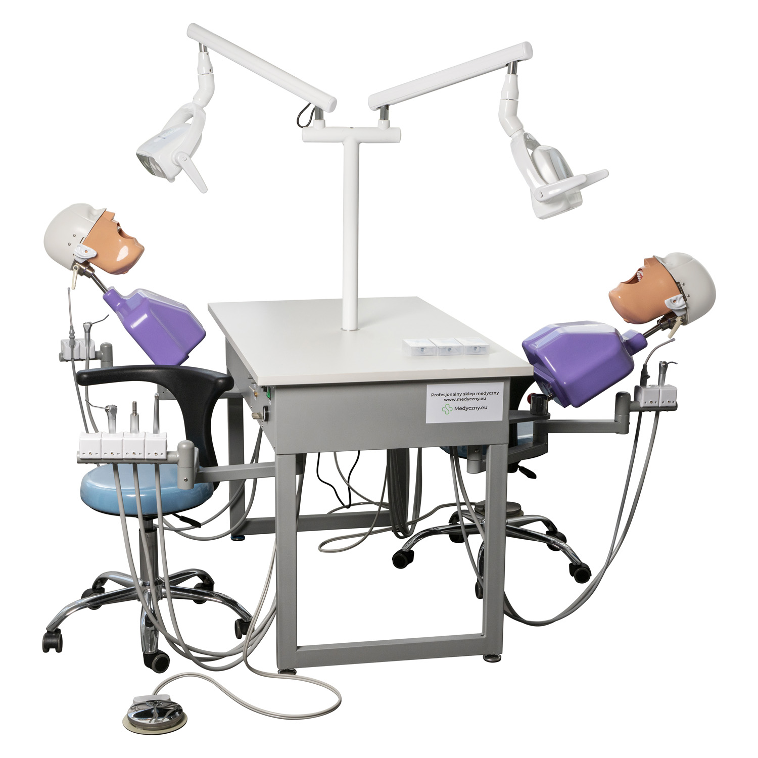 Die Einheit besteht aus einem stabilen Tisch, zwei Phantomen im Maßstab 1:1 (Kopf, Kiefer, Büste) mit einstellbarer Positionierung, zwei ergonomischen Stühlen auf höhenverstellbaren Rollen, zwei professionellen Lampen und Sets mit zahnmedizinischen Basisinstrumenten. Darüber hinaus ist es mit zwei Fußpedalen zur präzisen Steuerung der zahnärztlichen Handstücke ausgestattet, was die Arbeit erheblich erleichtert.