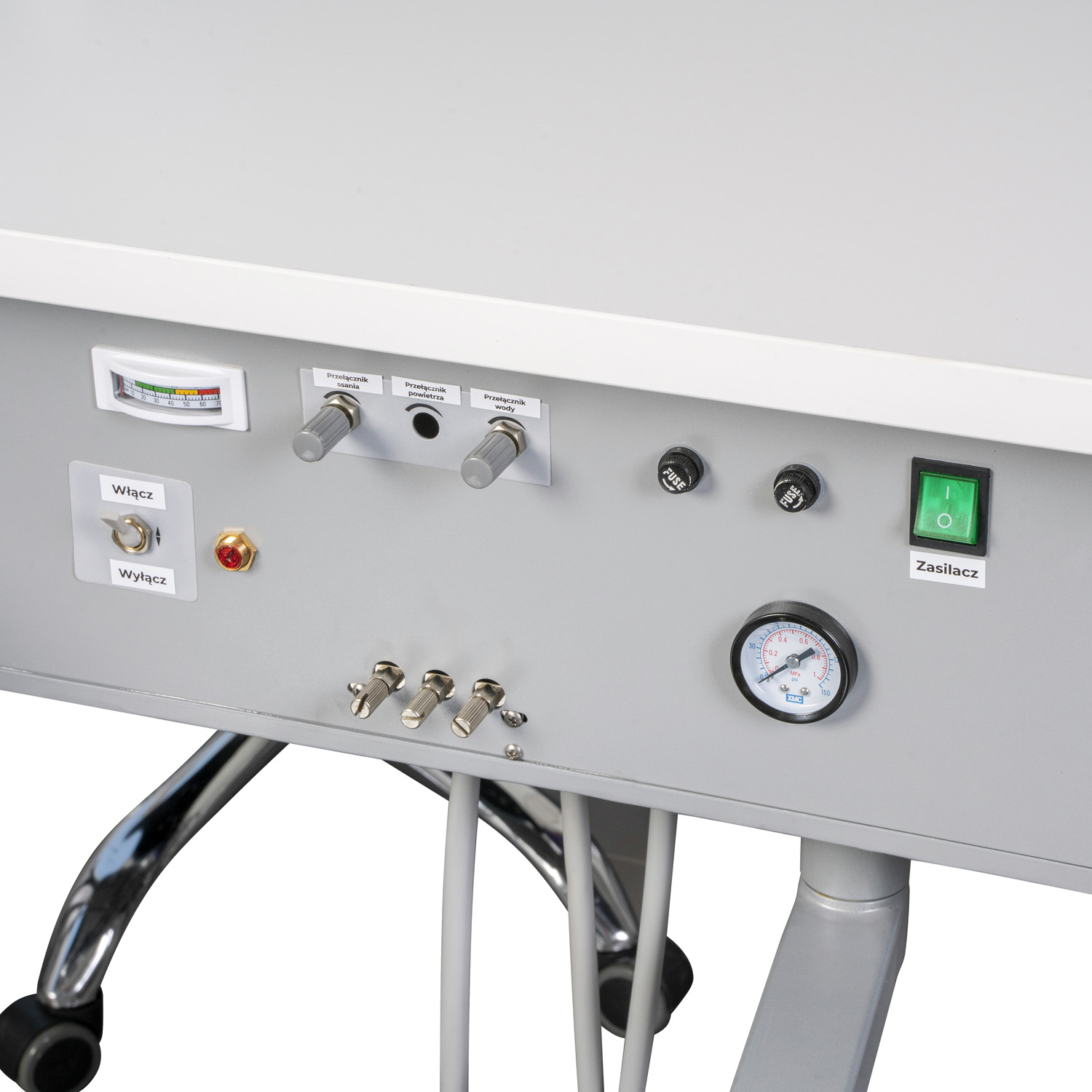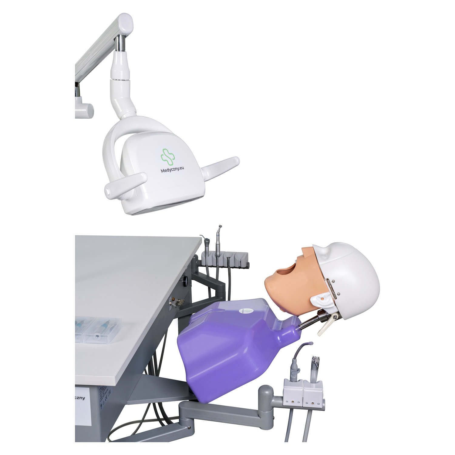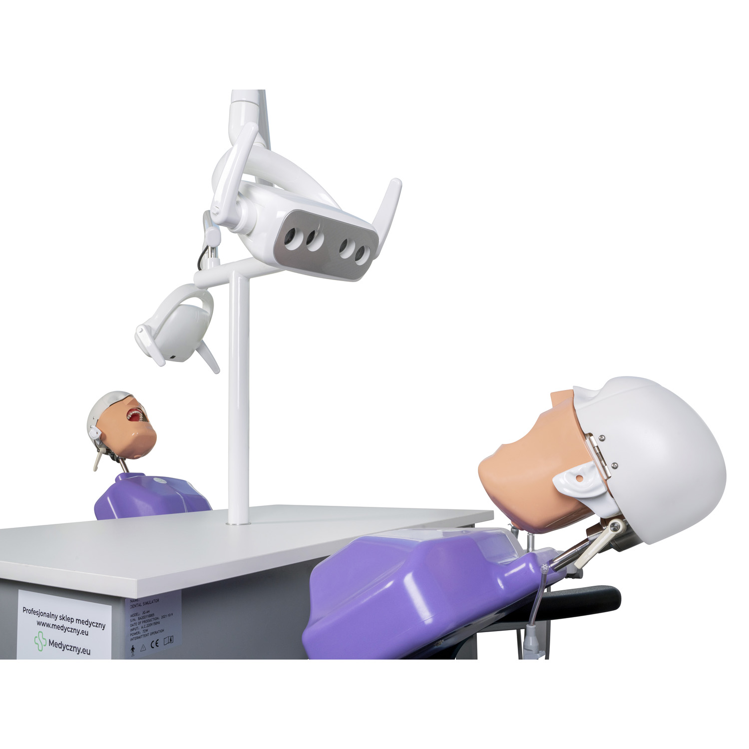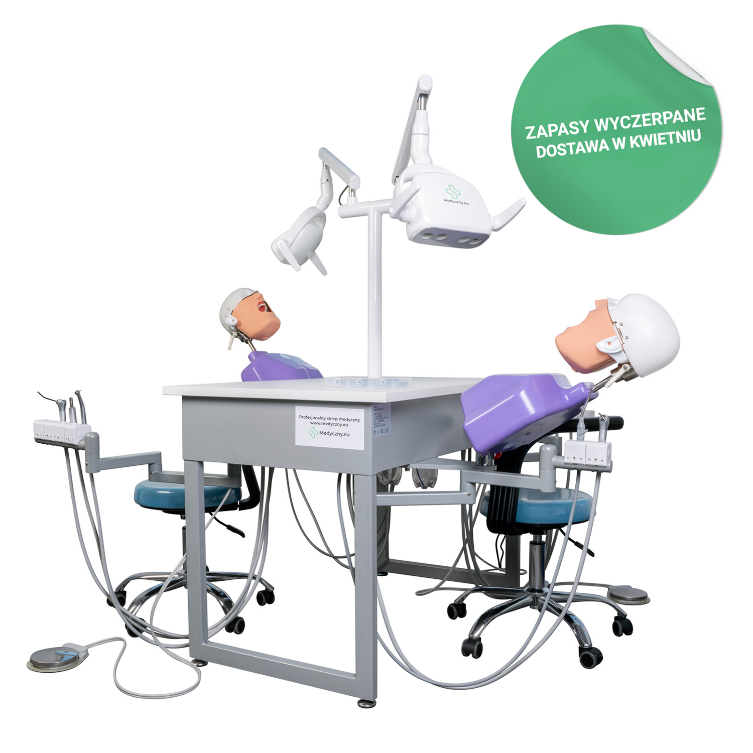 Die Einheit besteht aus einem stabilen Tisch, zwei Phantomen im Maßstab 1:1 (Kopf, Kiefer, Büste) mit einstellbarer Positionierung, zwei ergonomischen Stühlen auf höhenverstellbaren Rollen, zwei professionellen Lampen und Sets mit zahnmedizinischen Basisinstrumenten. Darüber hinaus ist es mit zwei Fußpedalen zur präzisen Steuerung der zahnärztlichen Handstücke ausgestattet, was die Arbeit erheblich erleichtert.