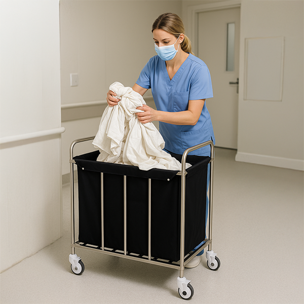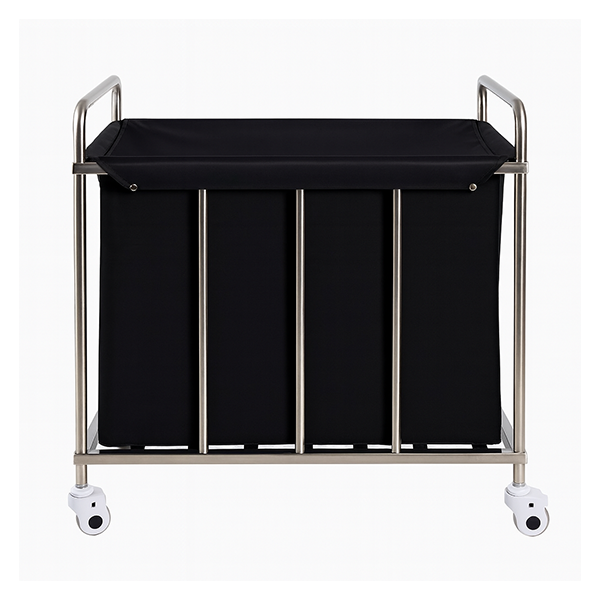 Der mobile Mehrzweck-Schmutzwagen hat einen Rahmen aus rostfreiem Stahl, der ihn korrosionsbeständig macht. Eine leicht abnehmbare schwarze Stofftasche ist im Lieferumfang enthalten, die mit Karabinerhaken am Rahmen befestigt ist. Er kann leicht abgenommen und bei Bedarf gewaschen werden, was die Aufrechterhaltung der Hygiene erleichtert.