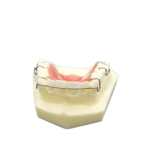 Das Modell demonstriert die klassische kieferorthopädische Behandlung und zeigt, wie die Zähne nach der Behandlung gehalten werden. Es besteht aus einem weißen Kunststoffsockel und realistisch nachgebildeten Zähnen und zeigt den Hawley-Retainer - einen Metalldraht, der die sechs Vorderzähne umschließt und die erzielten Behandlungsergebnisse stabilisiert. Der Retainer ist herausnehmbar, so dass seine Leistung genau überprüft werden kann.