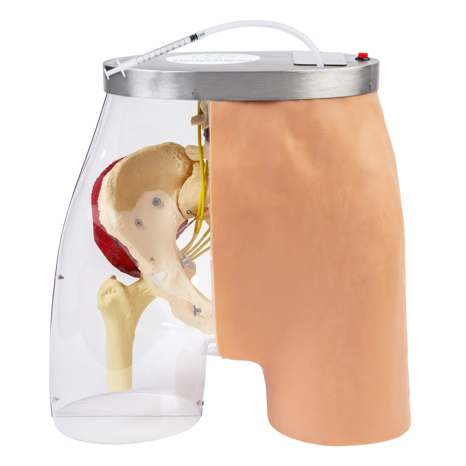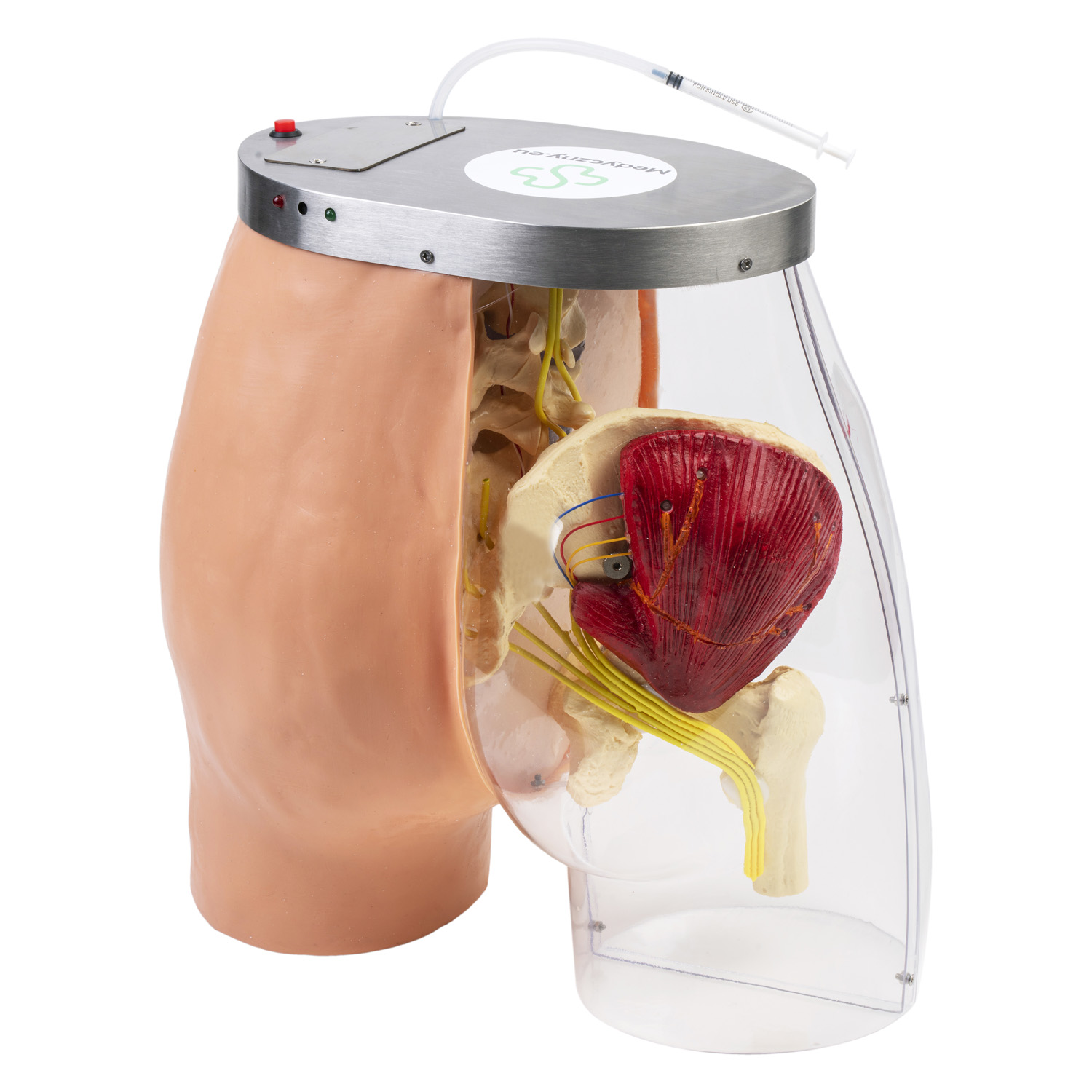 Der intramuskuläre Injektionssimulator ist eine originalgetreue Nachbildung des menschlichen Gesäßes und dient dem Erlernen und Perfektionieren der Injektionstechnik. Ein Teil des Modells ist mit synthetischer Haut überzogen, um realistische Injektionen zu ermöglichen, während der andere Teil, der transparent ist, anatomische Details wie Nerven, Venen, Muskeln und Knochen zeigt. Auf diese Weise kann der Benutzer die Struktur dieses Körperteils besser verstehen und lernen, wie man bei Injektionen empfindliche Bereiche vermeidet.