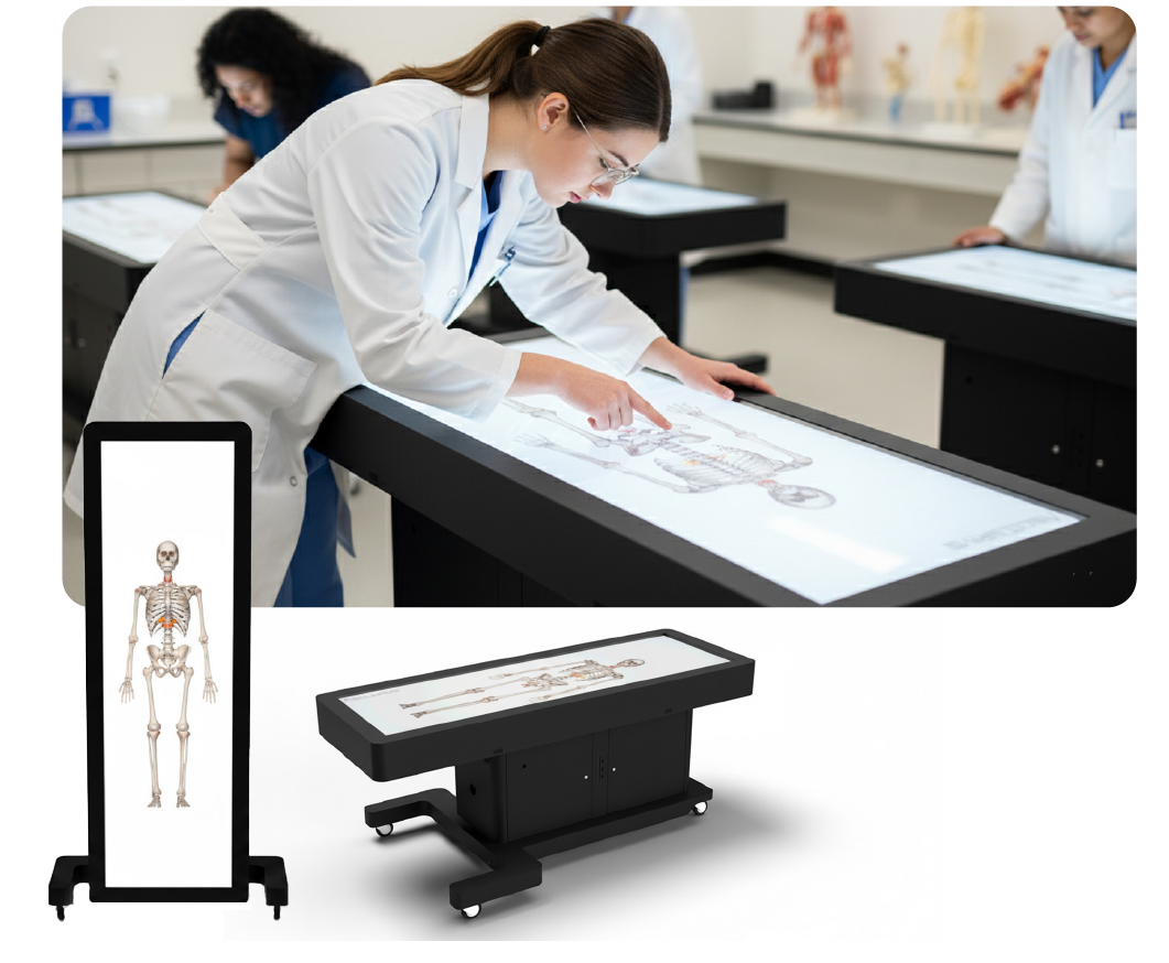 Der Virtuelle Lerntisch ist ein interaktives Gerät, das für Studenten und Dozenten der Medizin, Krankenpflege, Physiotherapie, Zahnmedizin und anderer Gesundheitsberufe entwickelt wurde und der modernen medizinischen Ausbildung dient.